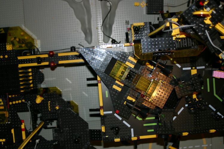 Moving to the right, we have an elevated landing platform with two pads. Clearly visible is an old Galaxy Explorer which has been retrofitted for use by Blacktron. It looks like modifications are primarily in paint. Note on the far right the large brick of spamcake being readied for loading. In the lower left we are looking down an elevator shaft in another building.