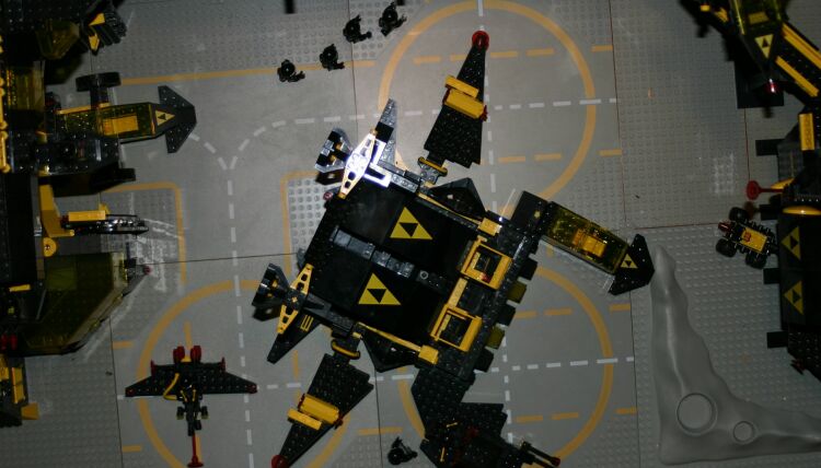 Here is a good view of the surface landing area and the fully loading Battrax Lander. Note the line of Blacktron troops in the upper part of this shot. Close observations of the pictures indicate that well over 50 Blacktron workers were at the base at the time of our flyovers.