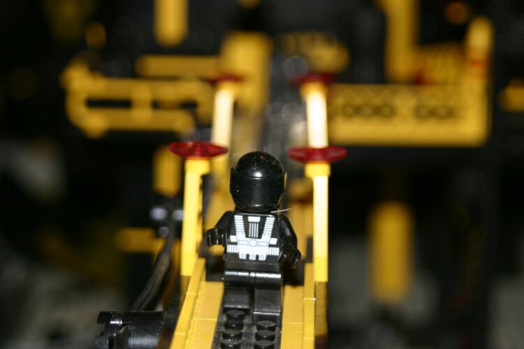 Looking out the walkway our probe comes eye to visor with a Blacktron worker.