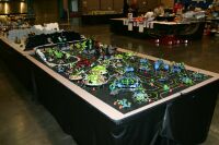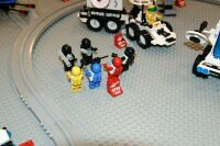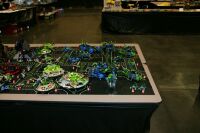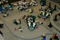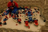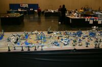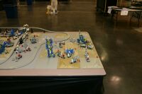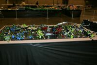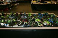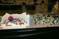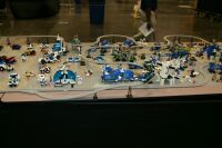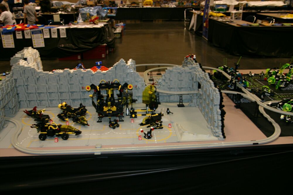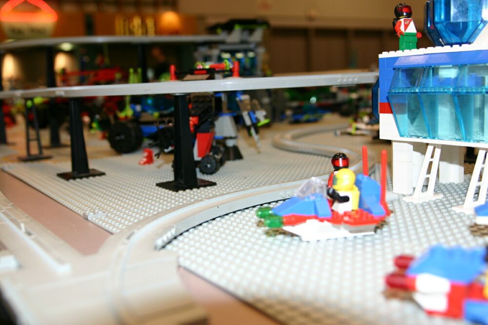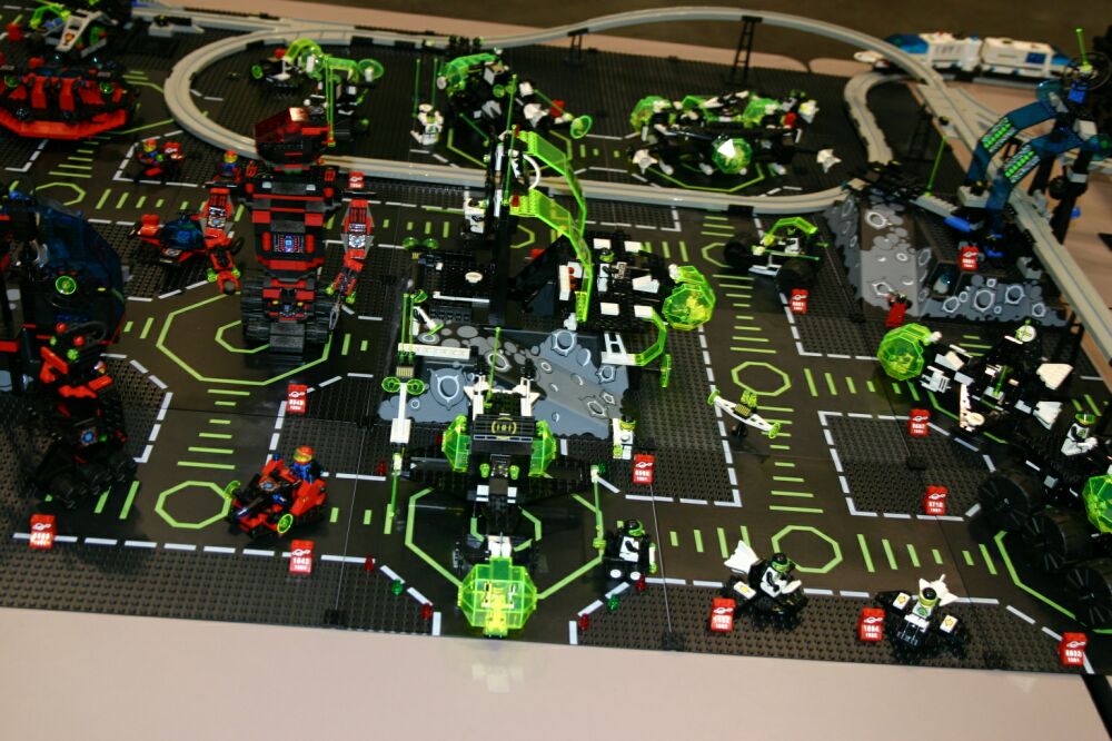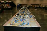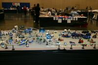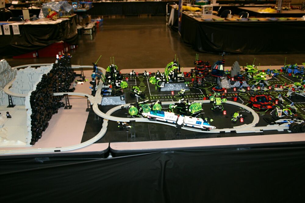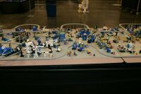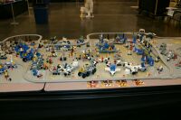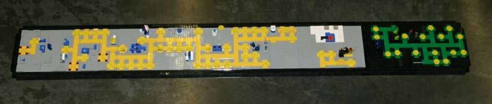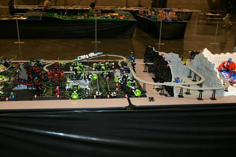 The layout ended up being 40 feet long and 50 inches wide, with some monorail bits going wider than that, up to 5 feet. It covered 10 8' banquet tables. The area covered by baseplates was 5 by 47 32x32 stud baseplates, for a total stud covered area of 235 baseplates, or 240,640 studs. It included brickscaped walls around the Blacktron I and Ice Planet areas, and separating the grey baseplate area from the black baseplate area. Overall the arrangement was by year and theme, oldest to newest, but varied so things went together well. A whole bunch of monorail track tied it together.
