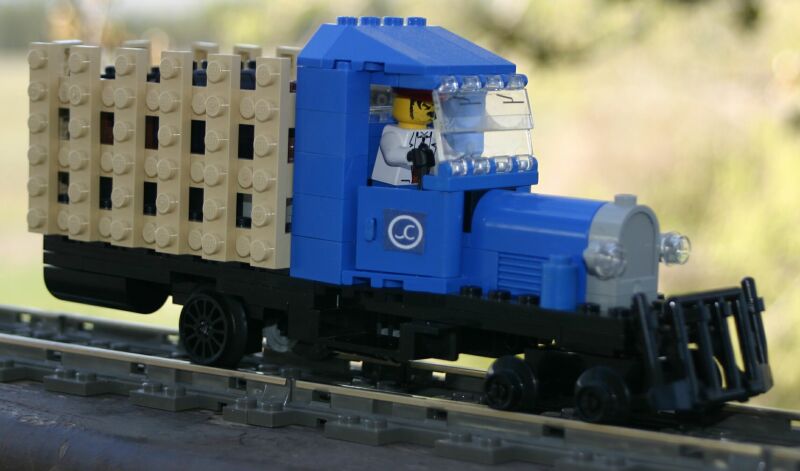This is my Lego rail truck. It is driven by a 9V geared motor which is powered by a 9V battery box under the cargo in the back of the truck. The split windshield is prototypical of the truck this is based off of. One pane can be opened for a breeze in hot weather.