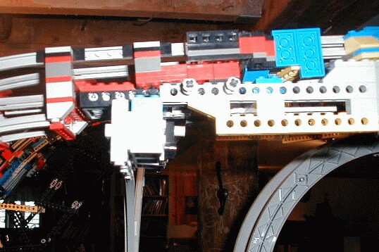 Here you can see the end of a monorail support arch, attached to some brick support work. Note the two visible Technic pins which help hold things together. The whole creation breaks into chunks for transport. The base table is 3 smaller tables.