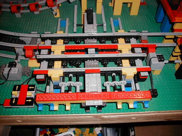 Just outside the station is the switching yard which has two working sets of tracks, each powered by 8 wheels on 4 axles to move the train backwards and forwards. This whole platform moves front to back to move a train off of the track for maintenance. The switches on the left control this platform and the wheels here and in the station area.
