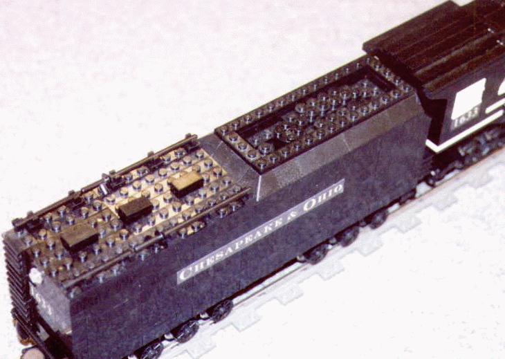 An overhead view of the tender. Note the prototypical 3 water intake hatches, rear ladder, hand rails, rear light and coal bin.