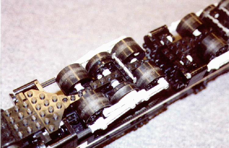 Here is a view of the front 6 driver wheels. Note there is only one set of hammers on this wheel set. You need two points to keep your wheels from twisting all over and off of the track. The second point is the 12V wheel set at the front of the train (barely visible in the lower left corner of this shot).