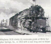 This is the prototype that my Allegheny is based on. This picture is from page 16 of the February 2002 Model Railroader magazine. The model shown is by Rivarossi, and it has a nice write-up. Other good pictures were found on ebay where this same model is being auctioned since it is no longer in stores (prices were around $500 in May 2002 when I was checking, pretty close to the suggested retail price of $585 (and you thought Lego was an expensive hobby!)). |