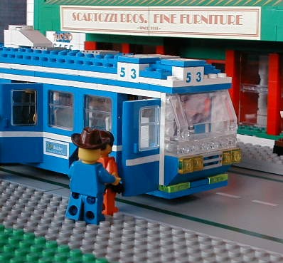Here is a view of passengers loading at the front of the bus. Note stud forward construction of the front of the bus, bus number 53.