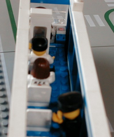 Looking to the front of the bus with the top removed. The fare box is visible in the front right. There is a windowed partition right behind the driver so passengers can't disturb him too much while the bus is in motion.