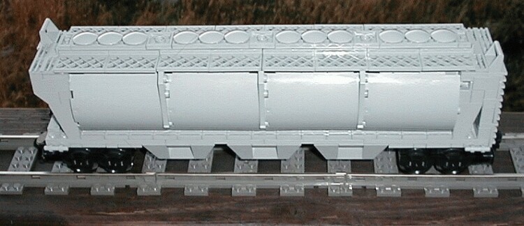 A top and side view. I used 1x4x2 fence pieces, pony-eared into the top plates, as walkways. I'm very pleased with how they turned out. Between the walkways are the grain hatches, attached stud-down between the inside edges. In a real hopper, the smooth hatches open to allow grain to be poured in the top. Mine easily pop off, but they are not hinged. They are not really prototypical, but I like the effect. A real hopper is really a pretty plain train car, and models often need to be more interesting than real life to be interesting.