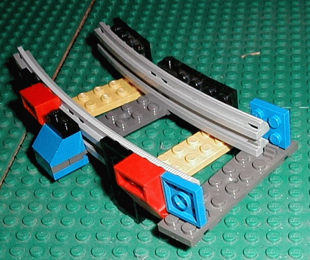 From this end view you can see that there is a 1 stud gap between rails. The less gape there is the less the rails will spread as the train goes by. The 1x2 blue sloped pieces you see also prevent spreading in the middle of each rail.