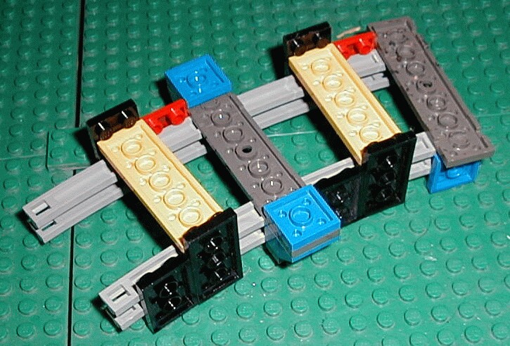 I use the yellow 2x6 plates in this picture of the bottom of the track to push out slightly on the black 2x4 plates which pushes in slightly on the top rails to keep them from spreading. Any brick or plate will work fine as a rail spacer between the track layers and I use build differently in various spots.