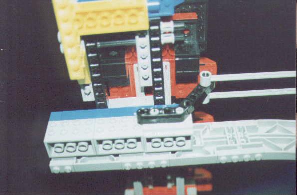 Here is where the bottom of the first curve is attached to the top of the big drop and to the monorail track support. The tension rod goes off to the right. Two Technic axle pins hold the top curve on at this end.