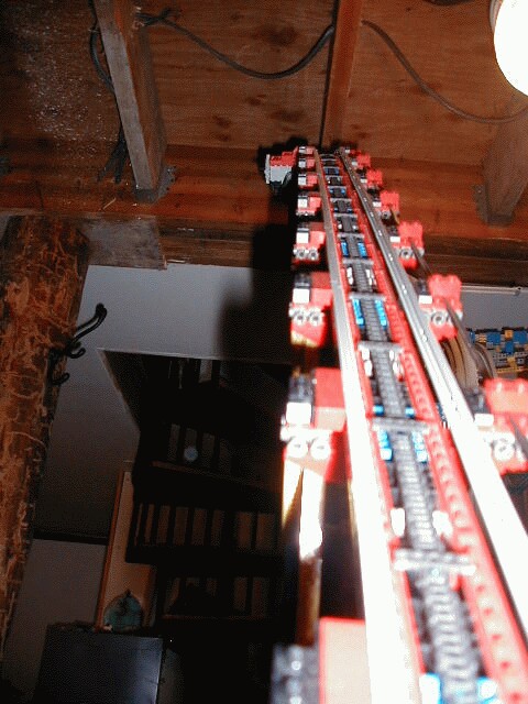 A riders view up the elevator. The electric cord to the top goes up the right side. The bulldozer links on the chain stay level on the bottom side of red 1x8 plates Under the chain is a brake mechanism that is designed to only allow forward motion and keep a train from sliding backwards there is a chain break.