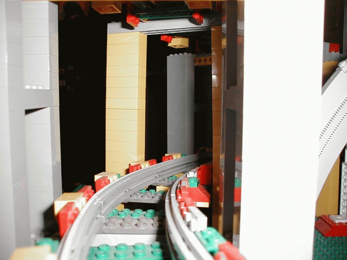 Here the track goes under itself though a tunnel of columns which are supporting the track above.